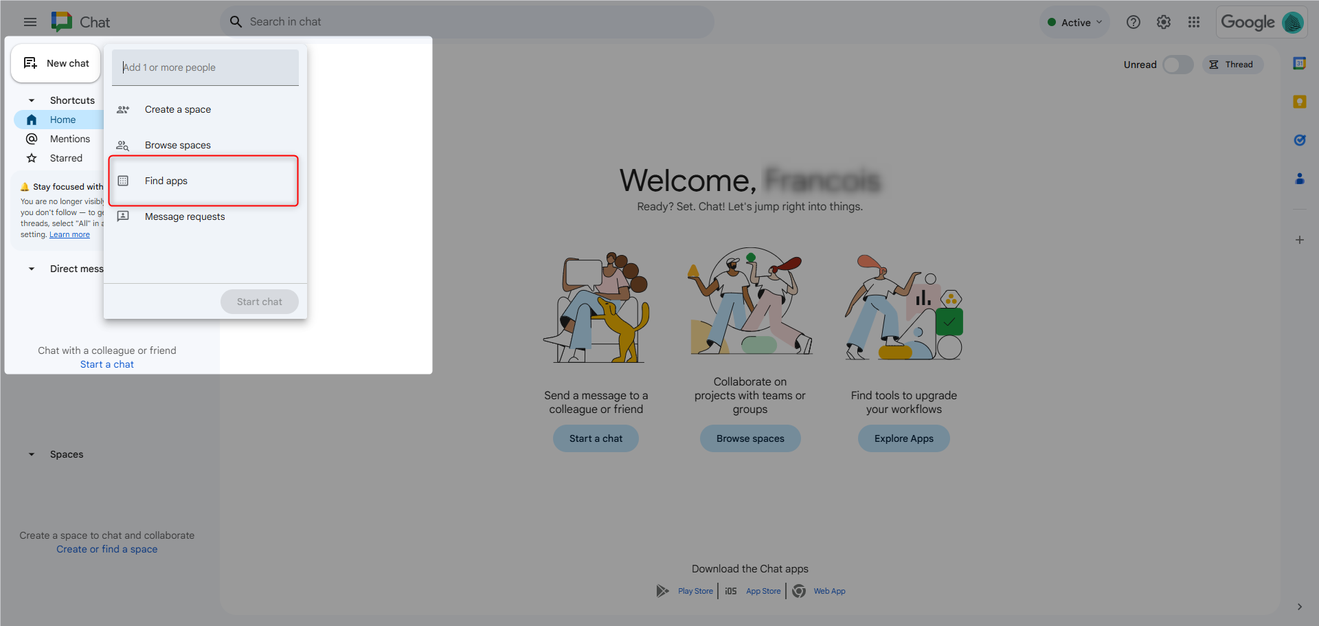 Utilisez l'interface pour accéder à la zone de recherche d'applications et trouver les applications disponibles. Dans Google Chat, cela se fait via « Rechercher des applications ».
