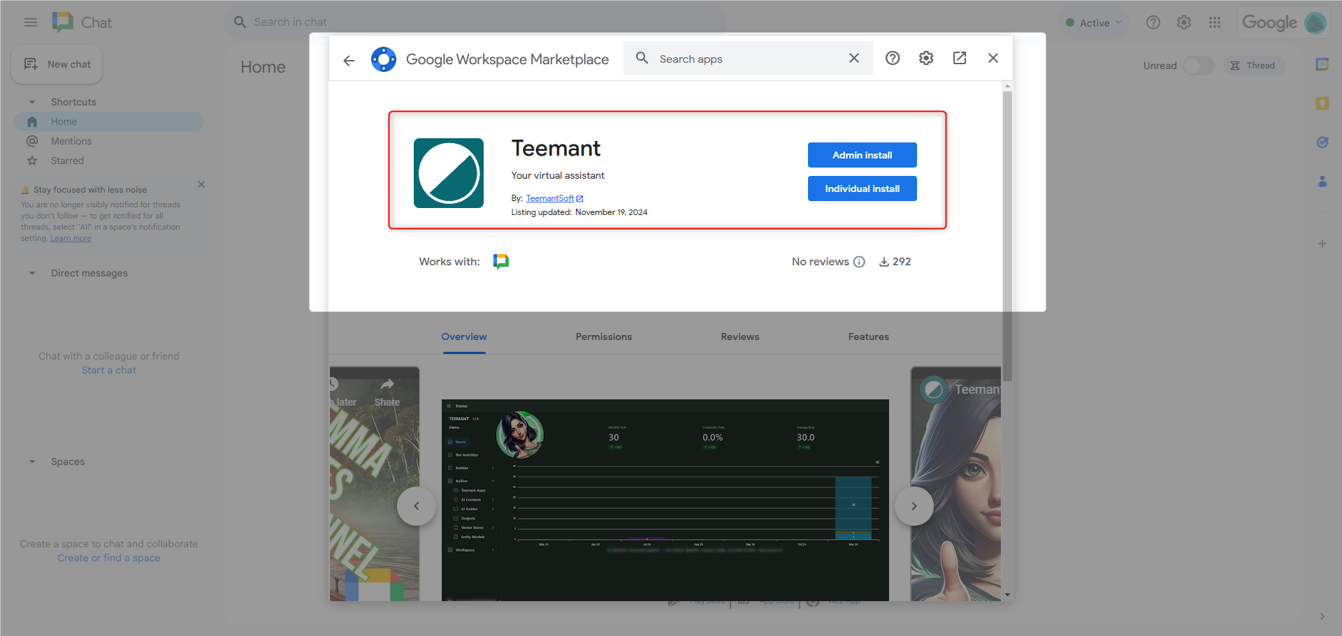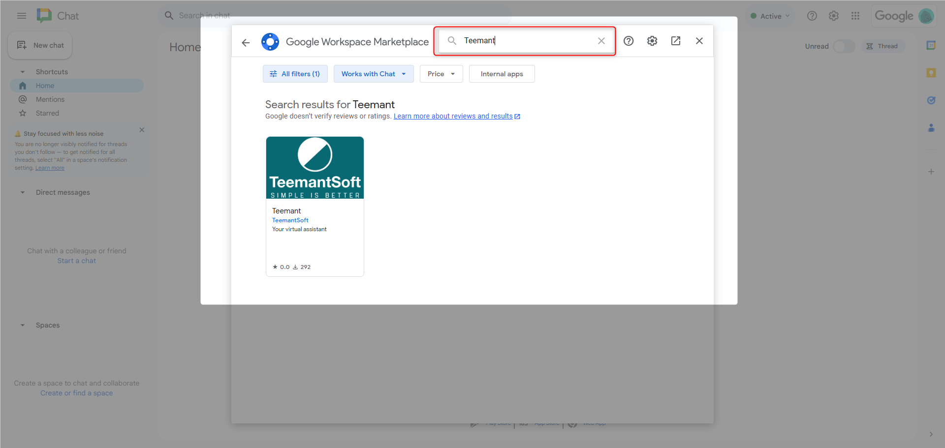 Ce guide vous accompagne à travers les étapes nécessaires pour installer et configurer l'application Teemant dans Google Chat.