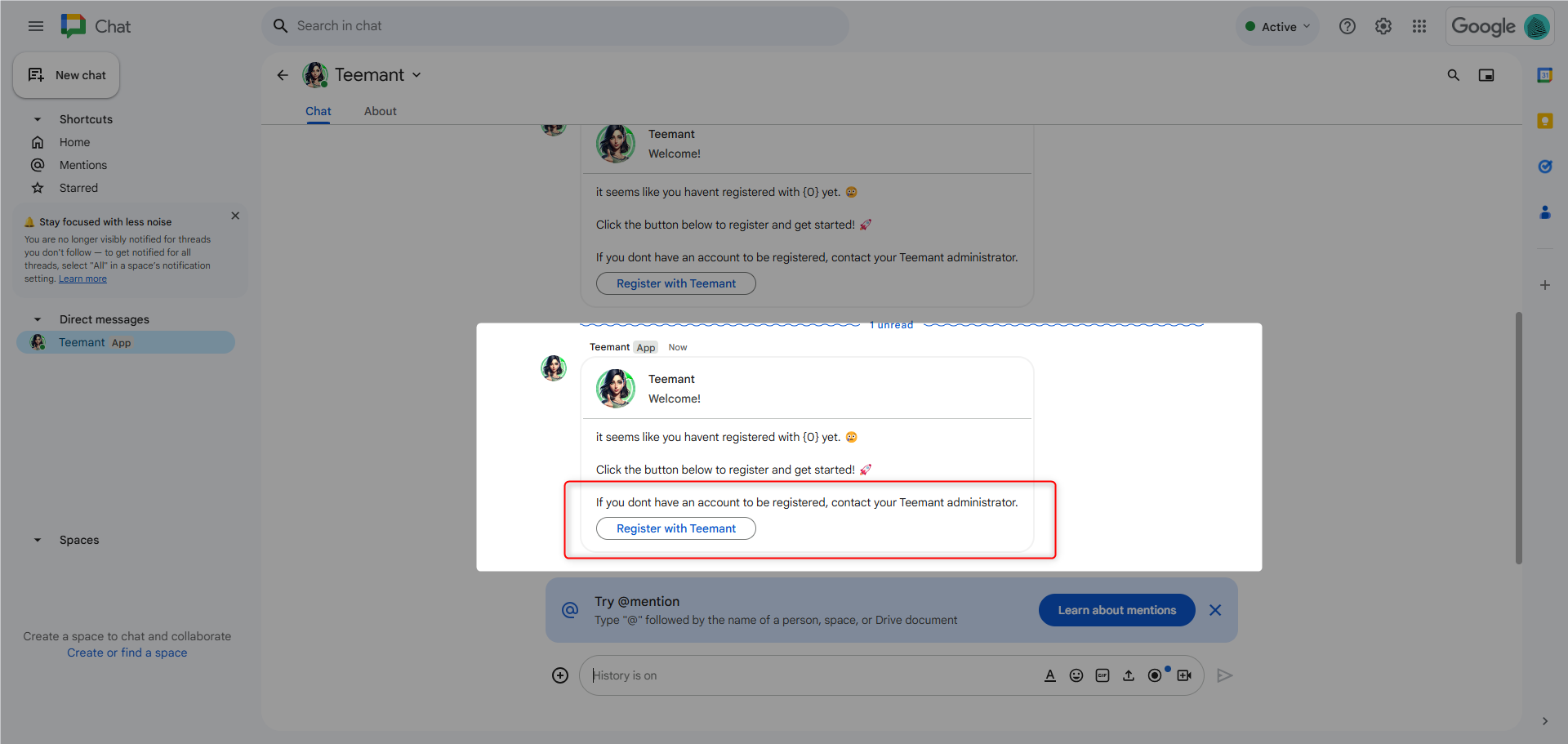 Une fois l'application installée, les utilisateurs peuvent commencer à interagir directement avec le bot Teemant dans Google Chat.