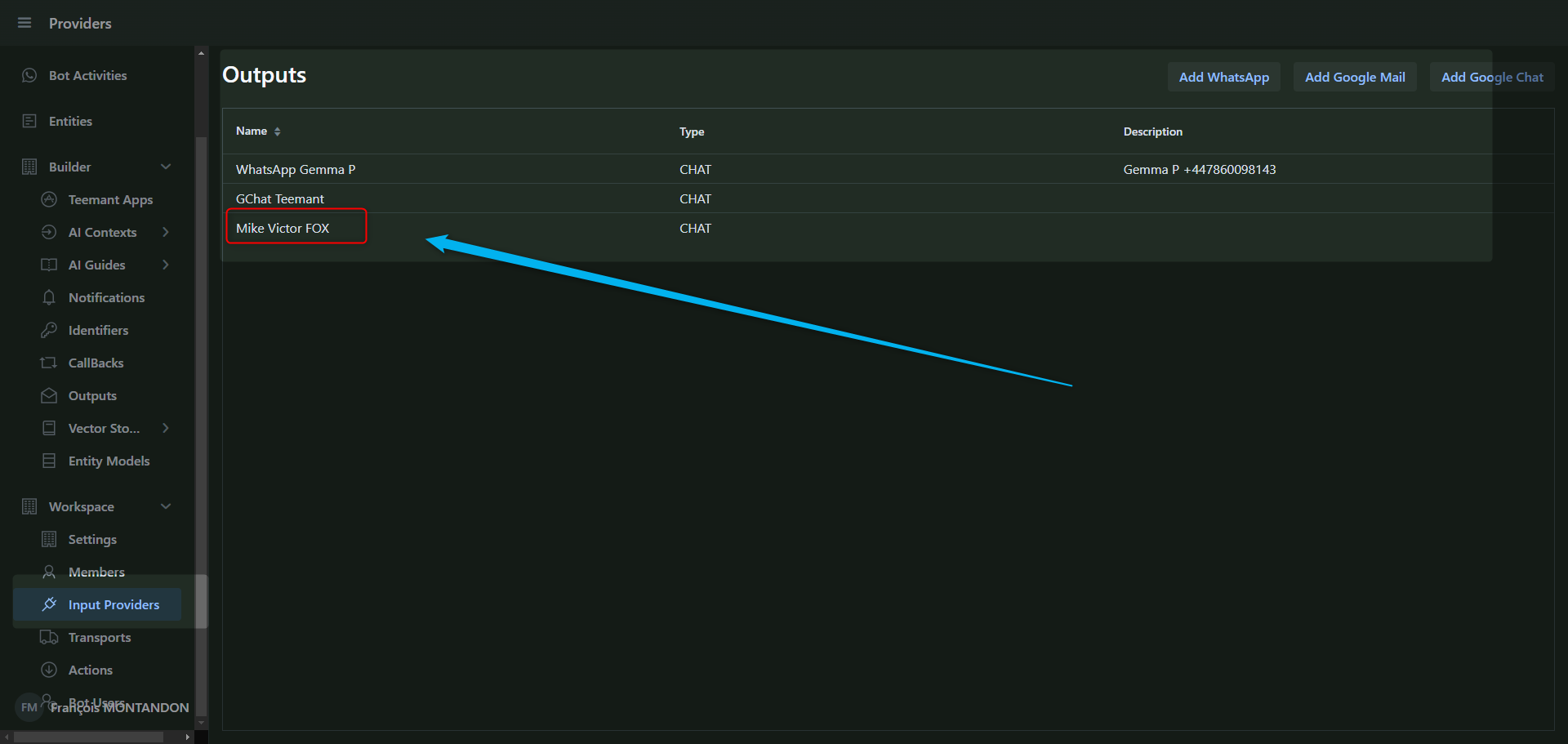 Une fois l'inscription terminée, connectez-vous à la plateforme Teemant et accédez au canal concerné ou à la section Fournisseurs d'entrée pour vérifier que la connexion Google Chat a bien été établie.