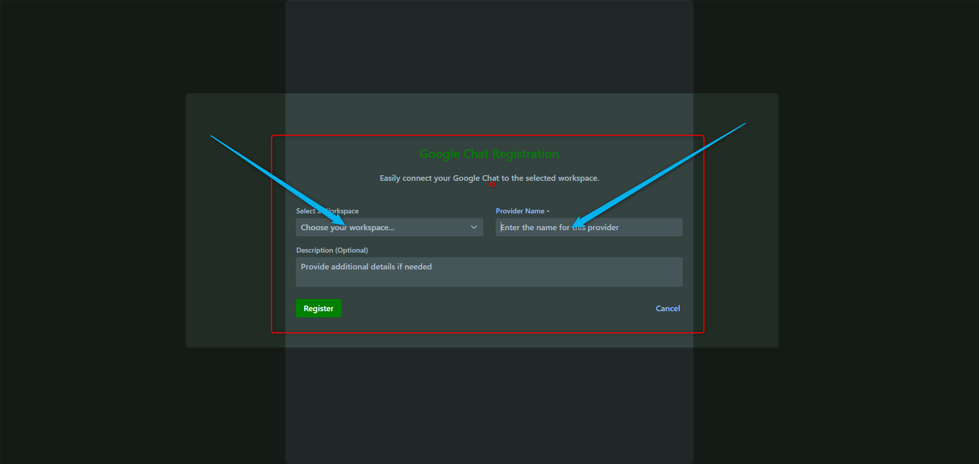 Lors de l'enregistrement de la connexion Google Chat, l'utilisateur ou l'administrateur remplit le formulaire d'inscription Teemant.