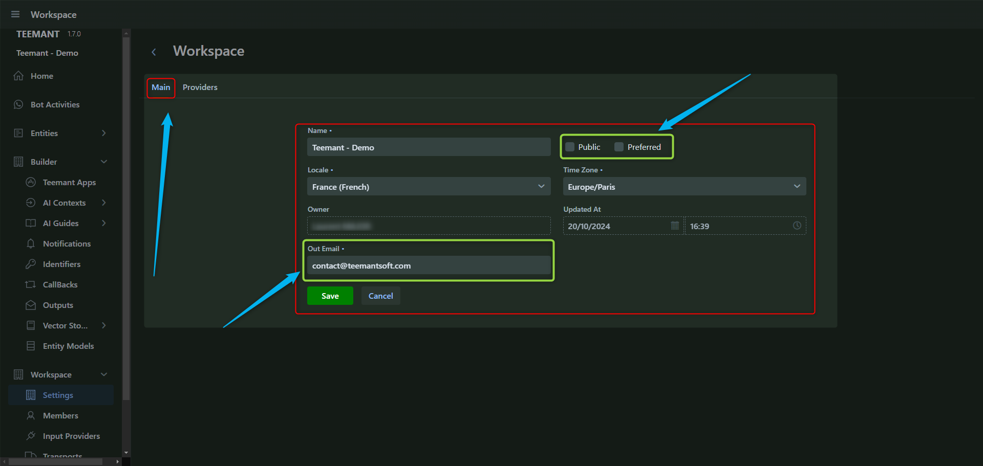 - Workspace: Configure access rights, members, bot users, and workspace properties.