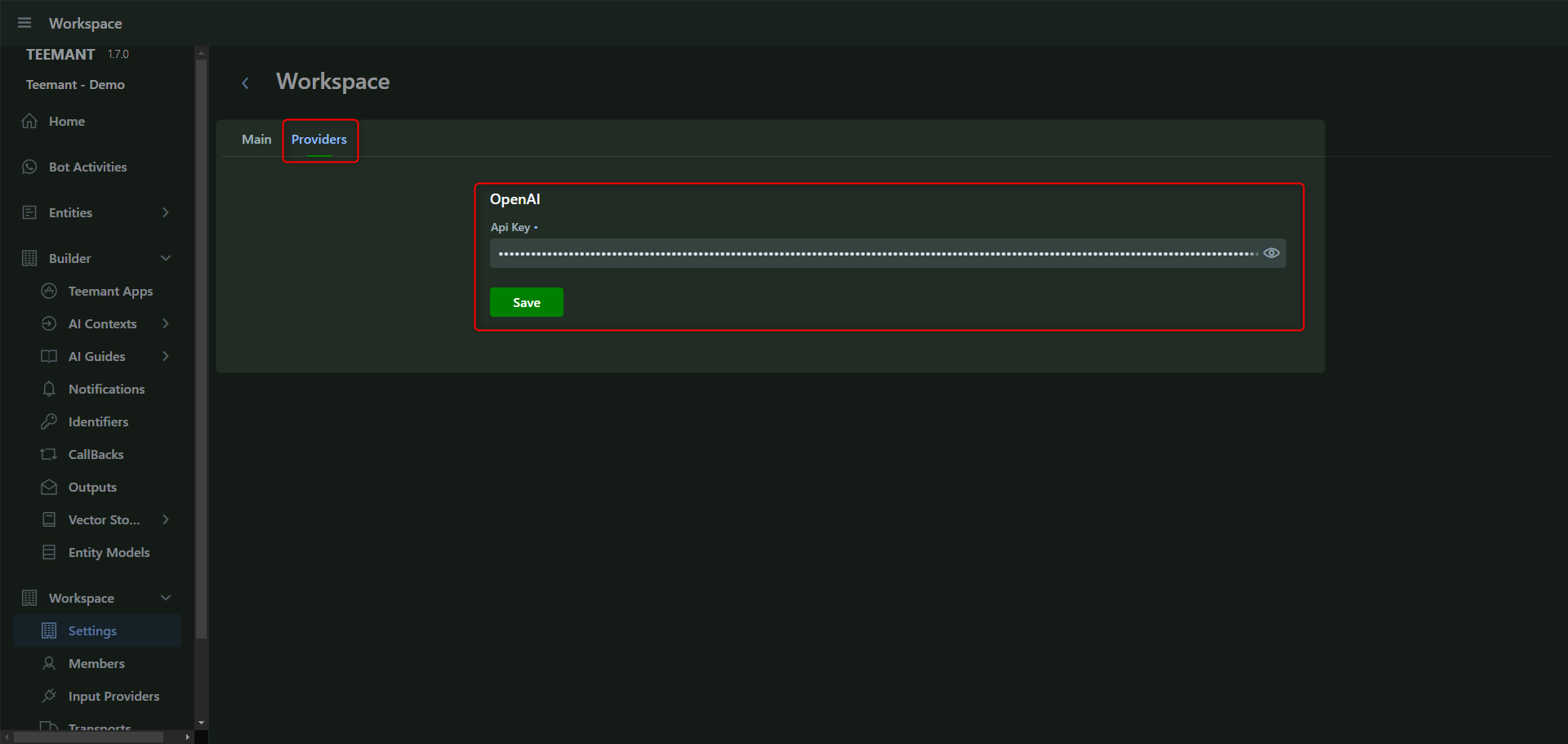 - Add the required API key for the AI engine (e.g., OpenAI).