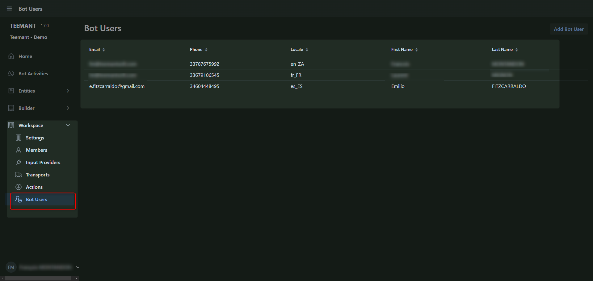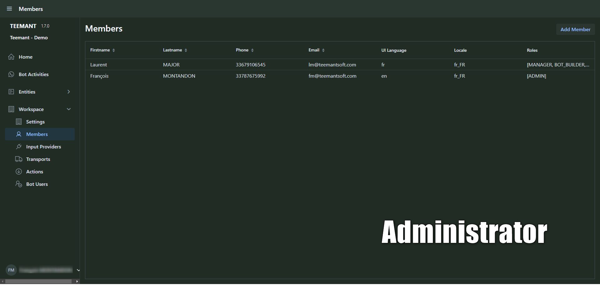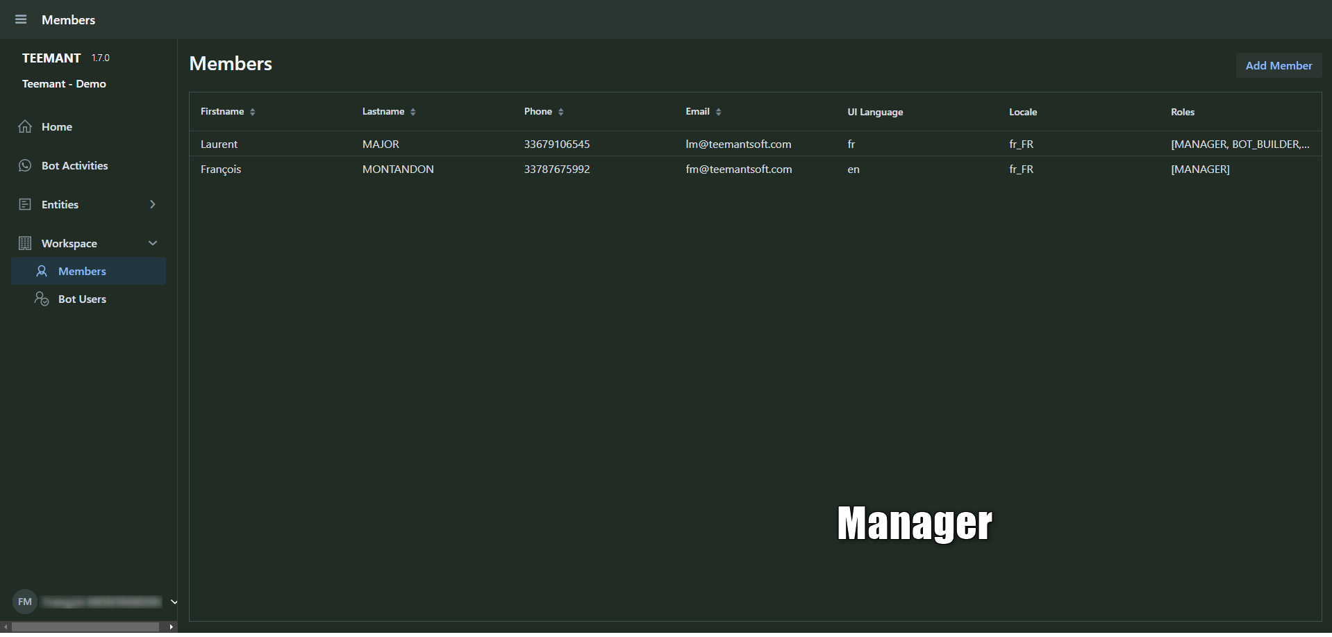- Oversees workspace operations, manages bot users, team members, and Teemant App deployment.