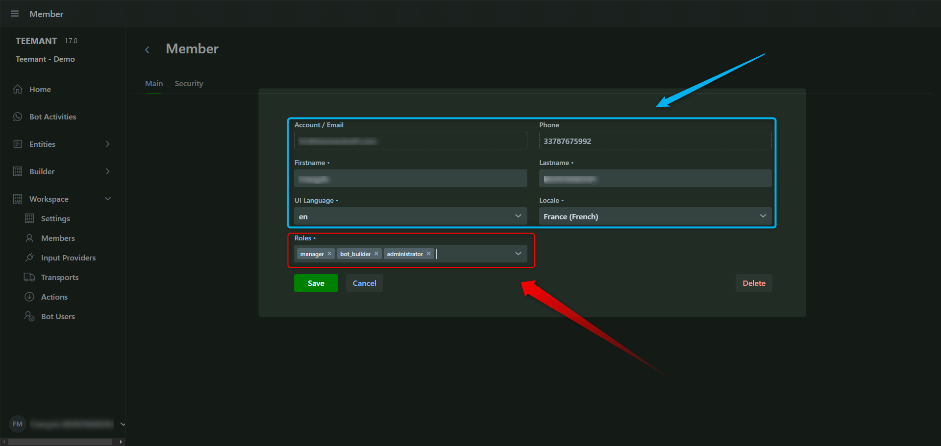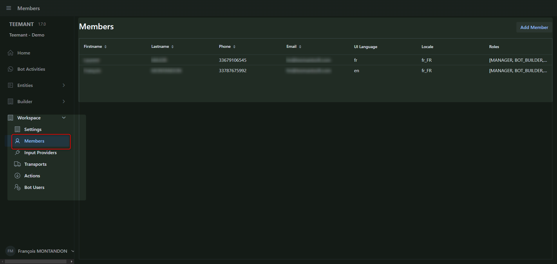 - Click “Add Member” to create a new user or select an existing user to modify their roles.