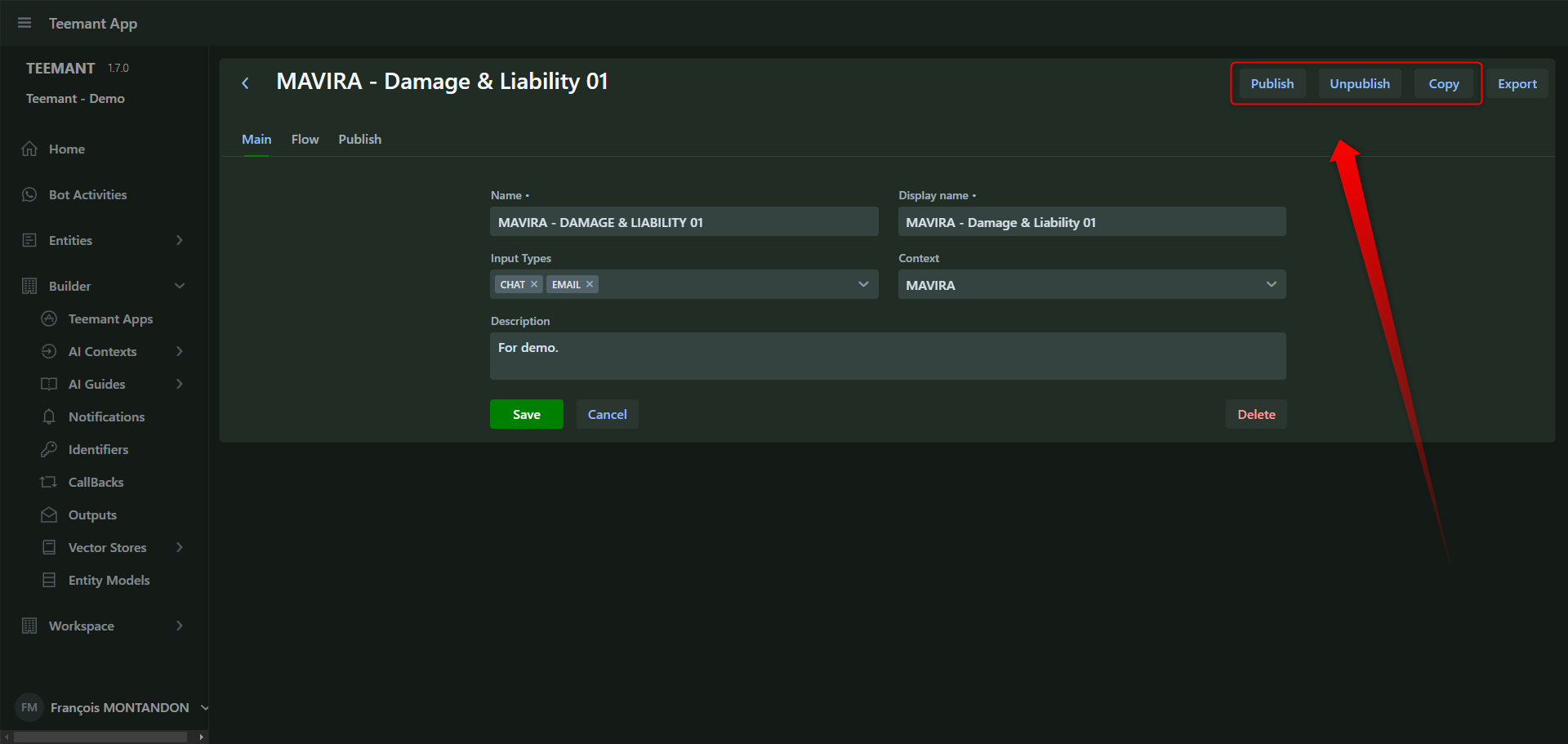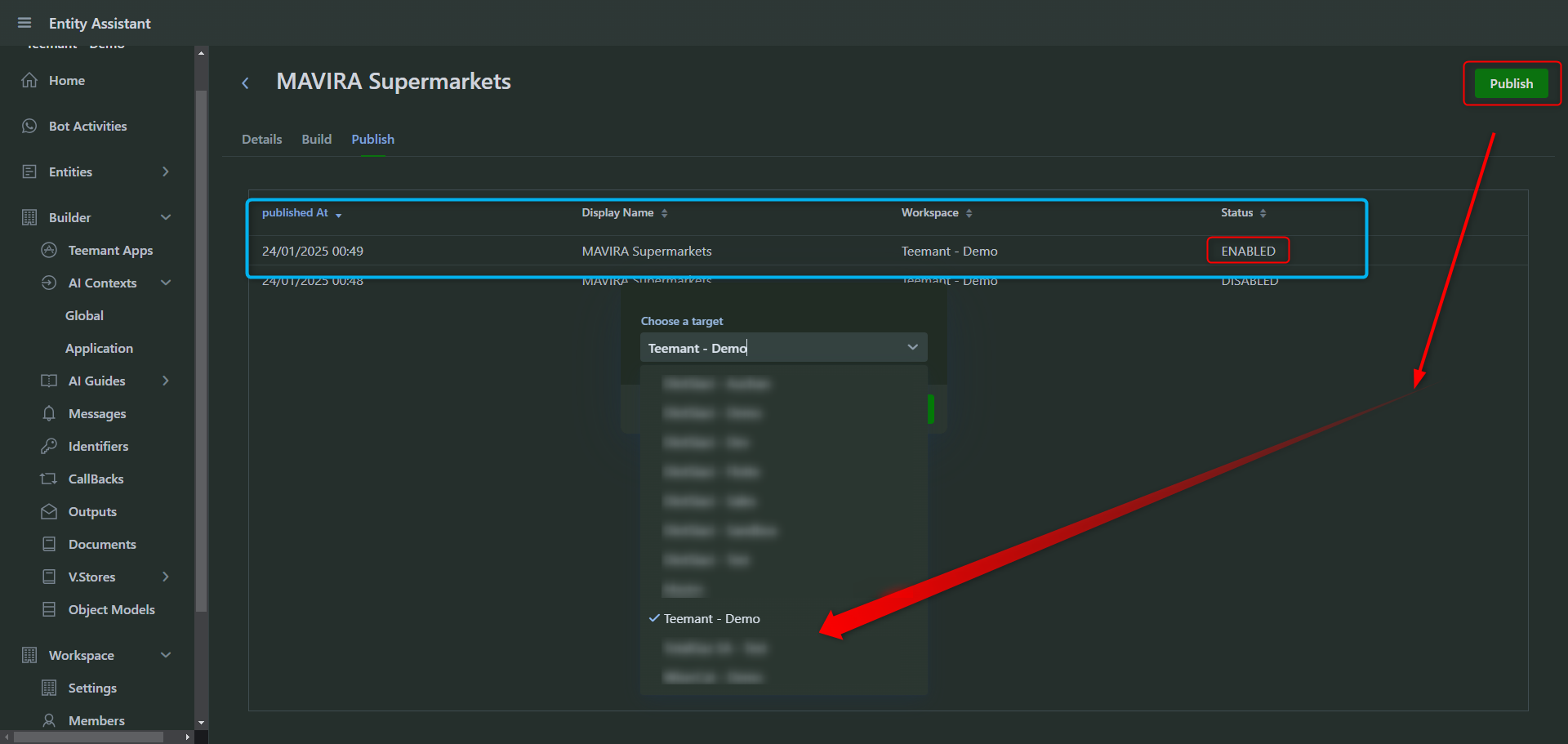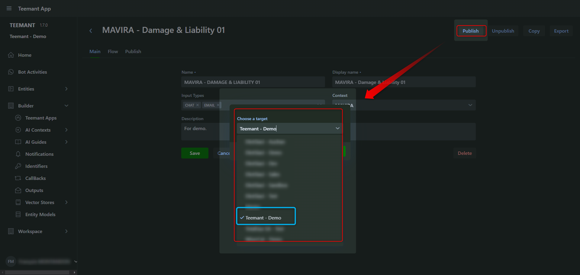 Publishing an application makes it available for use by a Teemant AI agent. Once published, the AI agent can execute the app when a bot user initiates a conversation via WhatsApp, Google Chat, Microsoft Teams, or other integrated platforms.