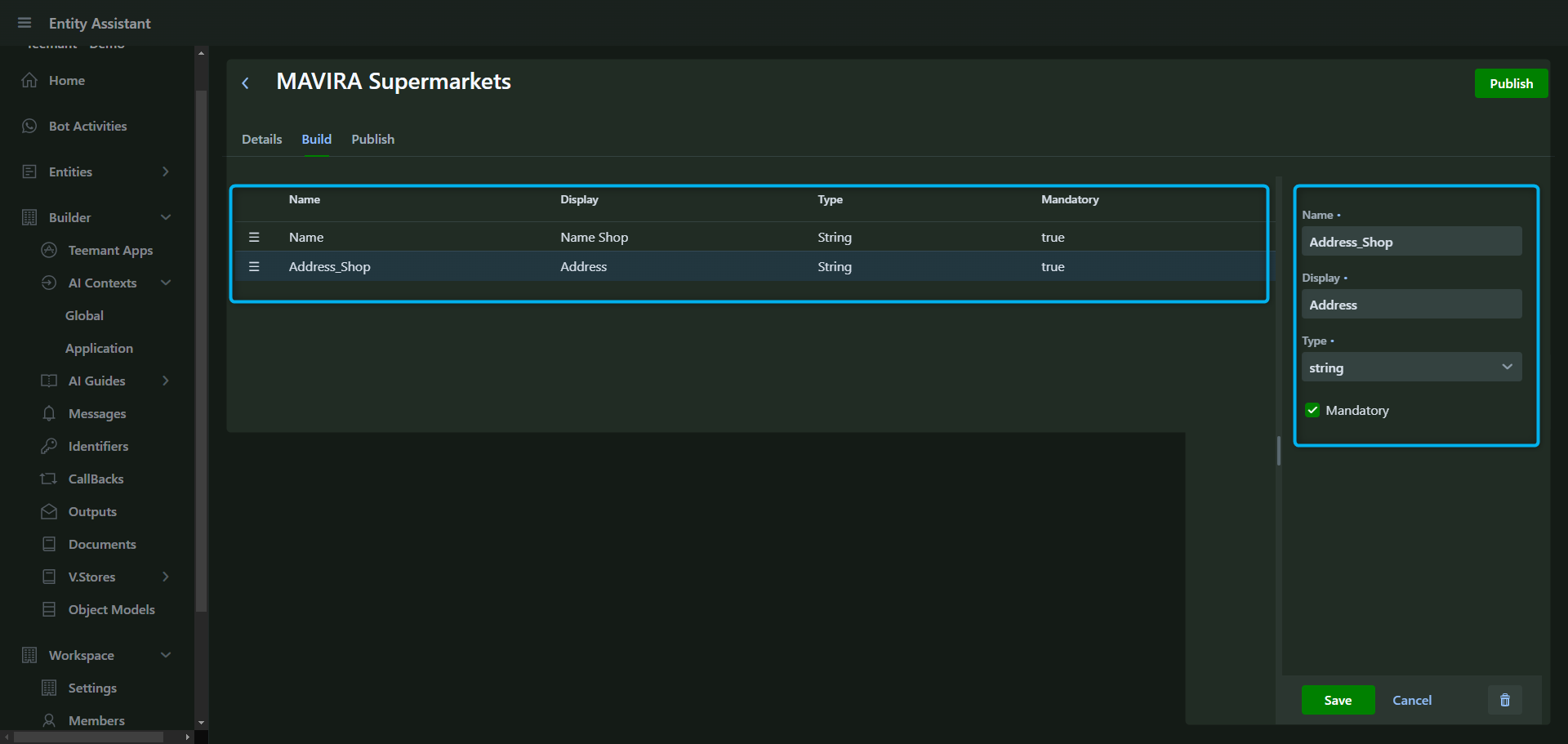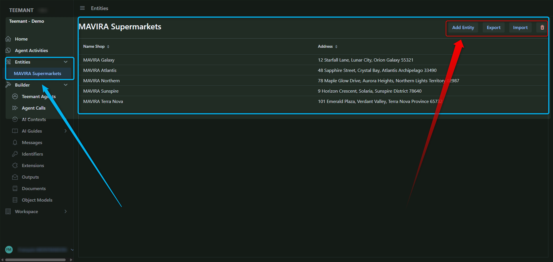 💡 Use Case: A company managing multiple store locations can maintain an entity called “Company Locations”, which contains all store addresses for AI-driven queries.