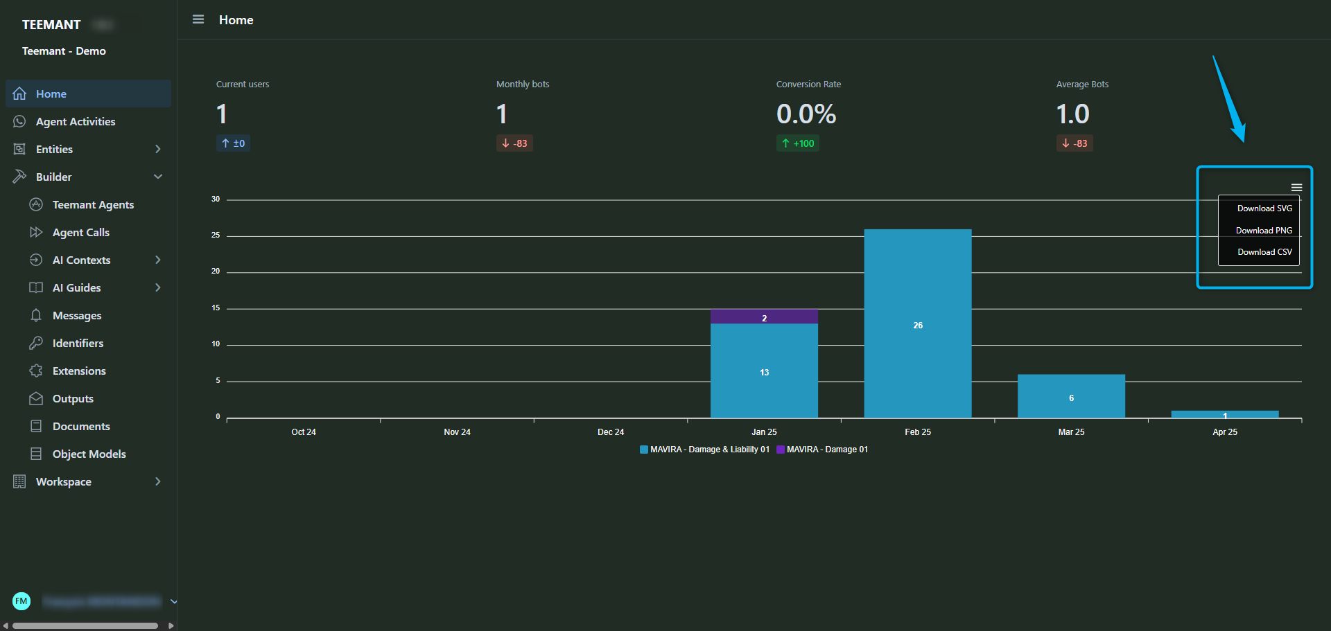 The Teemant Home Dashboard offers a high-level overview of AI agent activity within the current workspace. It is designed to help managers and bot designers monitor usage and performance of deployed applications in real-time.