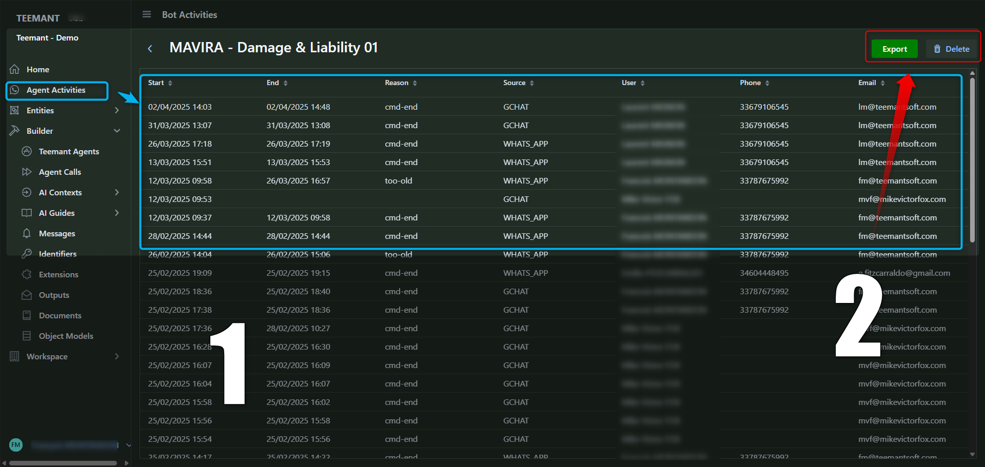 Agent Activities in TeemantSoft provide a detailed record of all interactions between Teemant AI agents (such as Gemma) and bot users. This section allows bot designers and administrators to review past conversations, analyze interactions, and export data for reporting or auditing purposes.